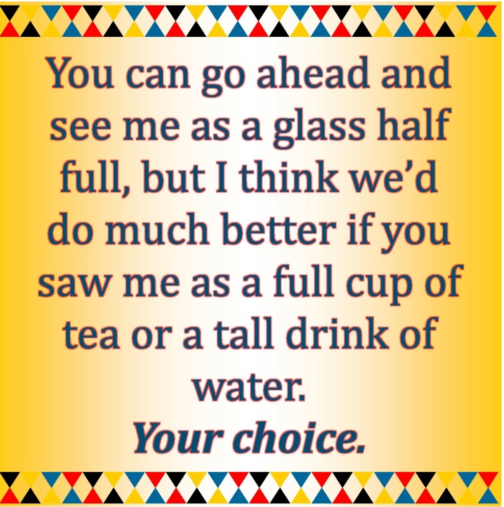 This gave me a little chuckle. But the truth is whether you see the glass half empty or half full, either way it is not one whole. Acceptance is seeing someone exactly as they are and knowing that they are complete right now. There is nothing to add and there is nothing to remove.