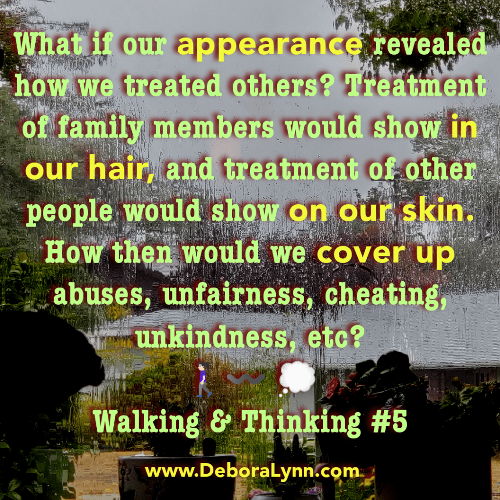 I was remembering a suggestion someone made, tongue-in-cheek, about how politicians should wear suits or jackets like professional auto racers wear. You know the ones that have patches and graphics all over them showing who their sponsors are? I wish we would do that. It will never happen though. They don’t really want us to easily identify, or in some cases ever identify who donates to their campaigns because then we would really see what is behind their masks and who they really serve. But then that had me thinking a little further — about all of us. What if there were specific characteristics that showed the world who we are, what we are like as soon as anyone laid eyes on us — characteristics that couldn’t be changed? We already have issues with making assumptions based on skin, national origin, sex, etc. But what if naturally blue hair meant you hit your wife? What if checkered grey and green skin meant you were a cheater? What if lavender lips meant you were chronically mean? What if hair that grew straight up front, but tight and curly in the back showed that someone was a narcissist? Or what if whatever clothes we put on for the day and our bodies just instantly became tagged with these clues? What would that be like? Would that cause us to be kinder, to be quicker to care about how our actions affected others? The possibilities are endless… but I’ll bet a lot of us are glad this is just a daydream from a walk.